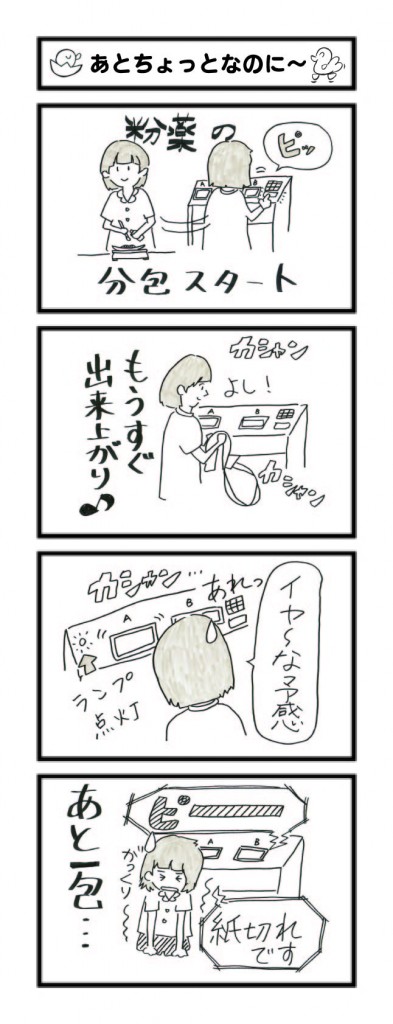 ある日のこと。分包がスイスイ順調に進んでいました!もうすぐ完成♪・・・ところが!紙切れのランプが点いてしまい・・・。